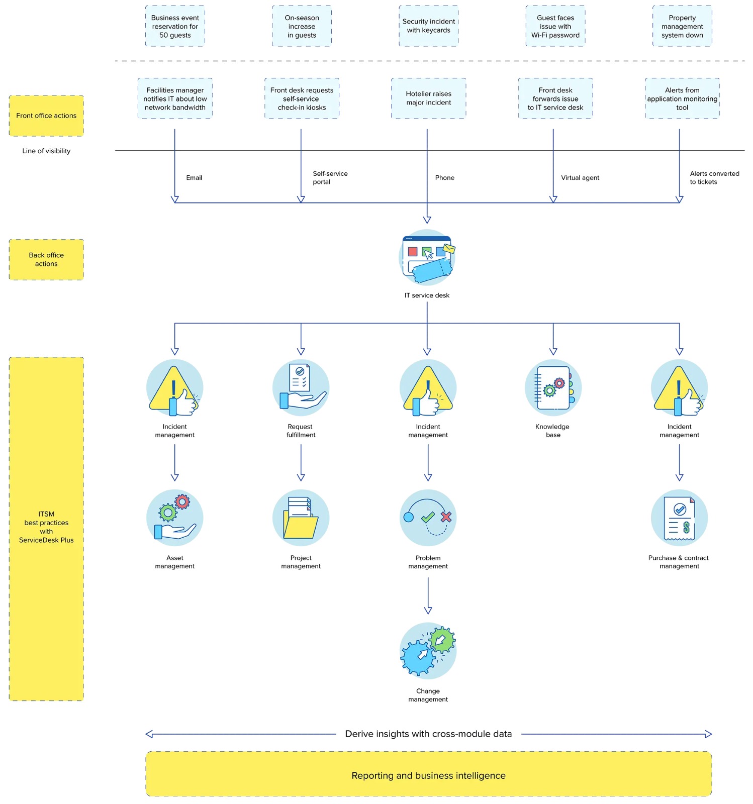 Without ITSM best practices in place, service teams are left firefighting urgent issues while falling behind on routine requests. This inefficiency not only slows down operations but also puts the guest experience at risk. Imagine a business conference in a hotel’s events hall where the IT team wasn’t automatically notified bandwidth is stretched thin, internet falters, and the entire experience suffers. Worse still, gaps in back-end processes can open the door to severe consequences, such as customer data breaches.
