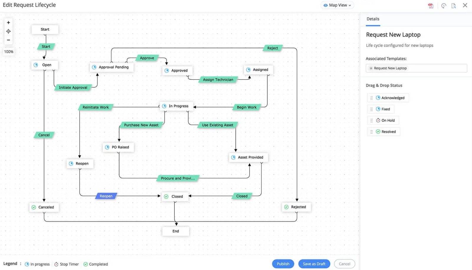 Standardized service delivery: Use Request Life Cycle to guide ticket navigation between statuses and ensure technicians follow structured transitions.